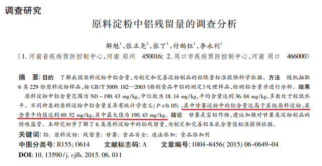 在制作粉条的过程中,还需要加入水、其他成分,所以会一定程度地稀释淀粉中的铝含量,铝含量的本底值可能会比上述平均值69.52mg/kg低。