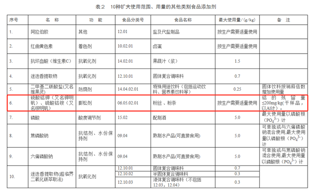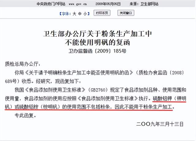 但后来因为粉条是某些地区的特色产业,这些地方政府一再向国家诉苦,出于实际生产的考虑,卫健委在2015年1月扩大了明矾的使用范围,允许在粉条中添加,但要求粉条中的铝不能超过200mg/kg。